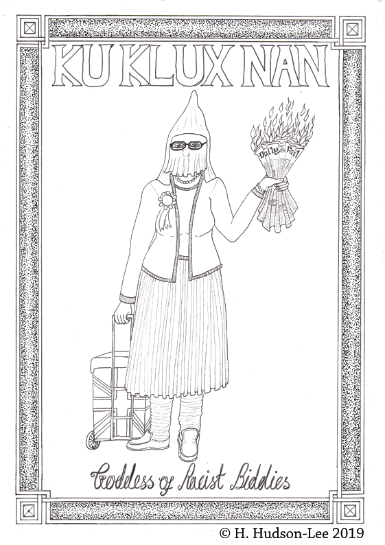 Ku-Klux-Nan is a truly ancient goddess. She’s 5987 you know, and she can remember a time before we had any of this nonsense. Much of what we know of the origin of this goddess come down to us through the surviving writings of the 4th BCE writer Xenophobe. In the days when there was but one pantheon known in the world, Ku-Klux-Nan was the Goddess of Quiet Lives. The first time she encountered a deity from another land, she was overcome by fear and jealousy. “How dare they come over here stealing our worshippers!”. This vitriol was so powerful that it warped her very form into that of a wizened hag with a mouth like a cat’s arse. It is said by some that she was rendered so hideous that she henceforth covered her fearsome visage with a white hood. Others say that she is wearing it because she just had a wash and set done and it’s drizzling. Ku-Klux-Nan has numerous Children and Grandchildren. They are all hideously embarrassed by her when she gets on about politics.