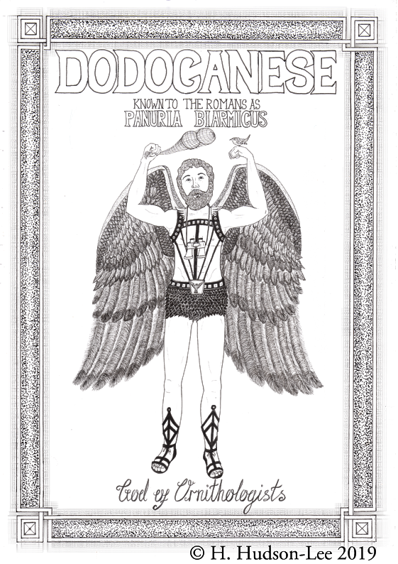 Dodocanese is a winged deity who watches over those who love all things avian. Like all gods, his blood is ichor-ous. When he was born, his father Crownus feared one day being usurped by him. He had the infant god exposed on a mountainside to be eaten by his crows. However, only a single corvid came. Therefore it was only an attempted murder. The crow pecked him free, and he was adopted and nursed to adulthood by a nice pair of Tits. Dodocanese now battles against the demons of habitat destruction. In this he uses his mythic weapon, a pair of mighty fat balls in a net which he swings at his enemies.
