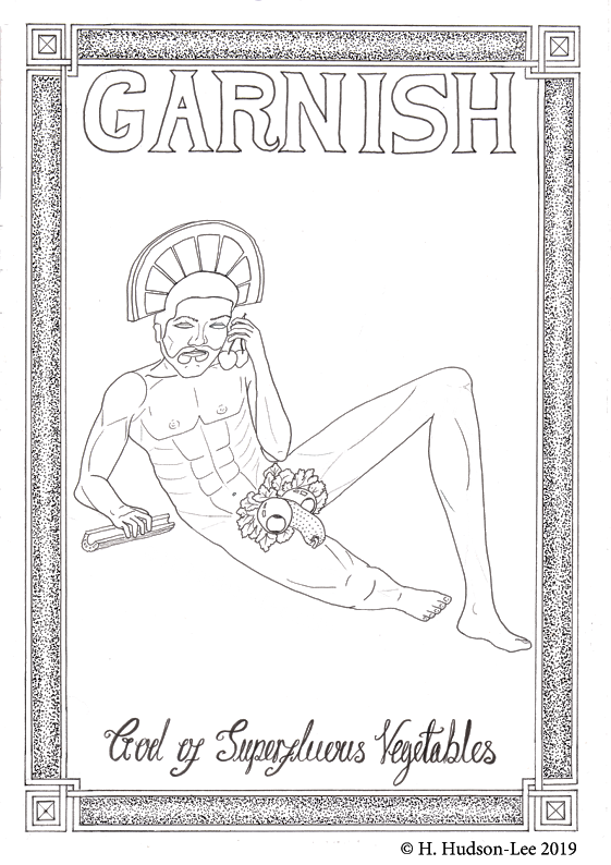 Garnish is a purely decorative deity. He is particularly associated with any fruit or vegetable one would never normally eat on its own, such as parsley, lemons and radishes carved into the shape of roses. He crops up in slight variations in many pantheons, but is thought to have originally been a Romaine God.