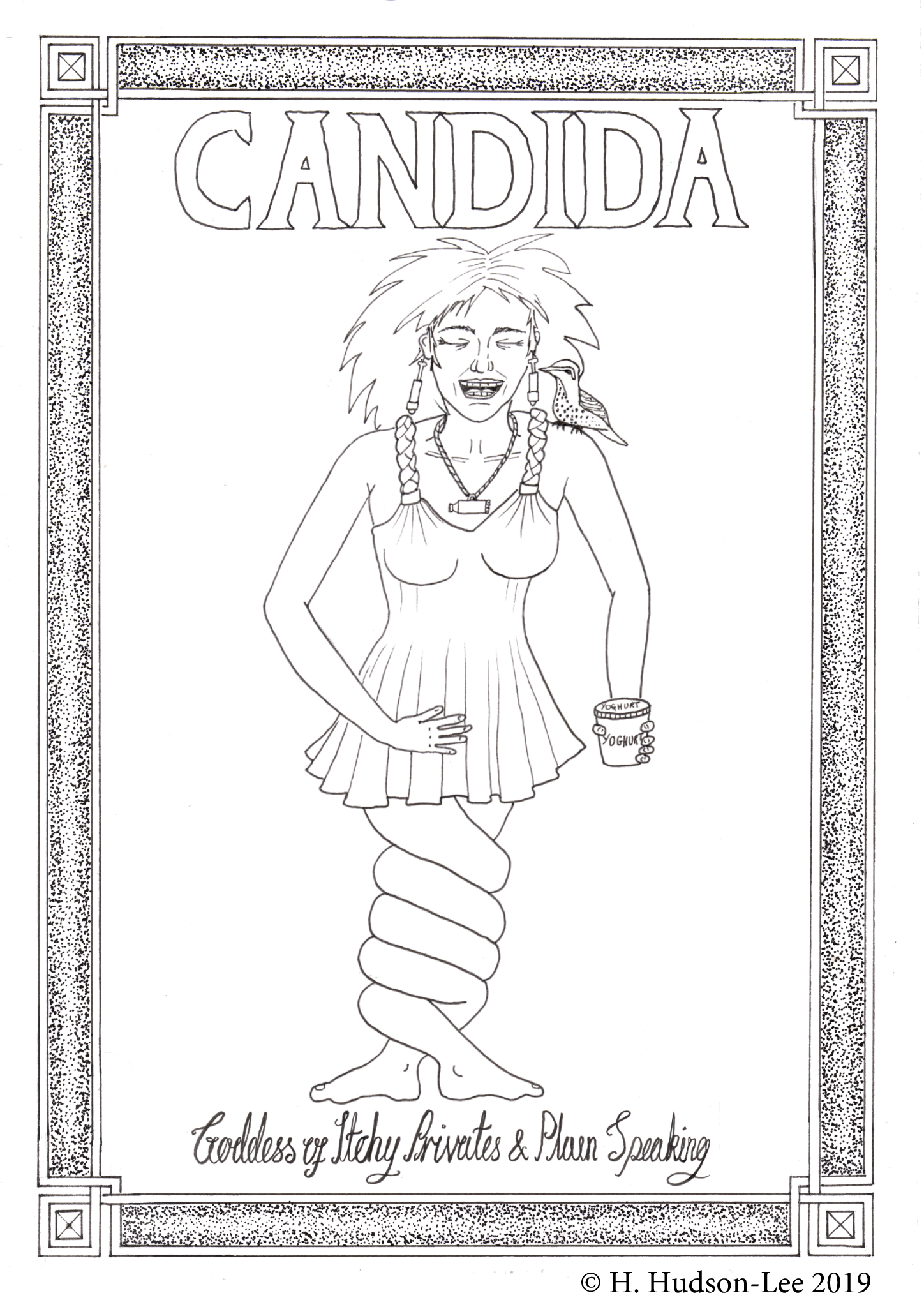 Candida is also known as “Throssel”, “The Beast from the Yeast” and “Lady Chalk of Billingsgate”. She was assimilated by the early Celtic church and Christianised as Saint Albicans. Thrushes are her sacred animals.
