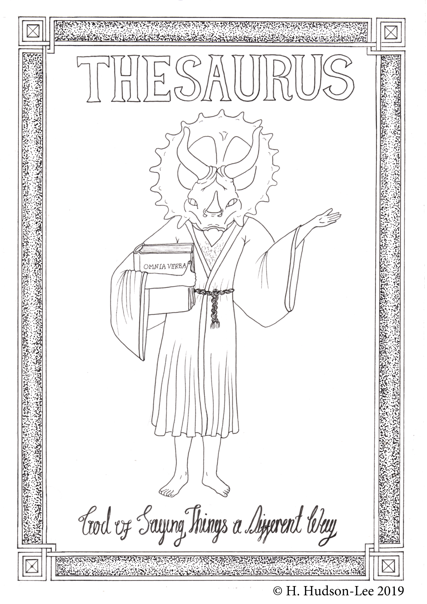 In the temple, the priests break their fast at dawn every day with a Synonym Roll. They are delicious, just like grammar used to make. They then spend the day in the sombre study of lexicography. They have made many great advances in this field, including inventing the word “Plagiarism”. They also discovered that the ancient version of our alphabet originally only had 25 letters, but no one knew why. If you see a priest of Thesaurus, dancing and flailing wildly, go to his aid and help him shake out his robes. He probably has an antonym. (They really go for the synonym roll crumbs).