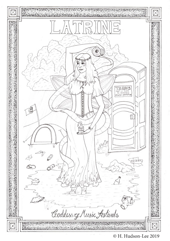 Latrine is principally a summer Goddess. Many think she originated in the 1960s, but in fact she is much, much older. It is said she was formed from the wet earth churned by the feet and spilled beer of the first humans to gather and entertain each other with turns around the campfire. She has no permanent temple, all music festivals are her sacred spaces. Latrine has the power to maintain good spirits in any weather. No matter how much it rains, she’s never a stick in the mud.