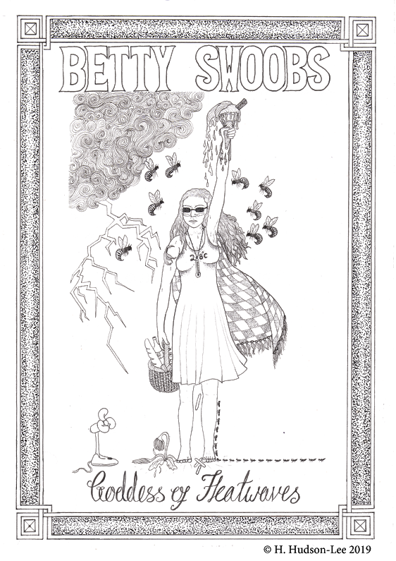 Betty Swoobs is the Goddess of Heatwaves in latitudes where extreme temperatures are only occasionally experienced. Sometimes known as the English Summer Goddess. She watches over all those who briefly bake in high summer temperatures approximately once a year. Wherever an air conditioner cannot be considered a reasonable long-term investment, wherever people sleep with but one foot under the duvet and whenever Linus puts down his blue blanket voluntarily, she is there.