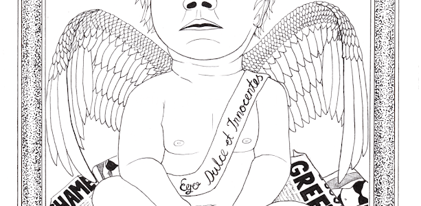 With the innocent face of an angel, the God Werentmee is impervious to all blame. Any excrement thrown his way slides right off. The divine light shining from his reverent rectum means that any shade thrown does not fall upon him. He has two other avatars not shown here. One is a lyre playing musician with flaming underwear and a nose as long as a telephone wire, and the other is the invisible divine ghost known to children and cyclopes everywhere as “Mr Nobody”.