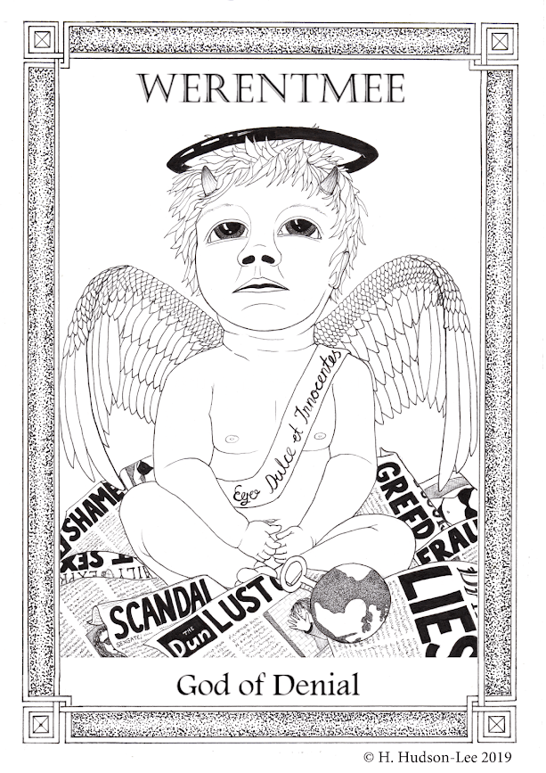 The philosophy of the cult of Werentmee is not to avoid the sin, but to avoid the blame, the shame and the consequences. His devotees include corrupt politicians, environment destroyers, emotional fuckwits and asset stripping CEOs who sink their companies. Essential personal qualities for joining the priesthood of Werentmee are twinkling charm, a posh accent, and a very short memory. Having a conscience is considered to be a severe handicap, and may render one unsuitable to serve.