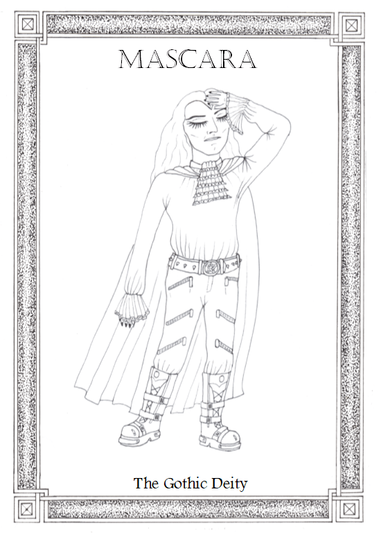Mascara is an anthropomorphic personification of darkness and degradation with flawless eyeliner. Mascara is more Goth than thou will ever be. They are said to have originated in the mysterious forests and mountains of north eastern Europe, the offspring of Captain Sensible (God of the Damned) and Siouxsie (Goddess of backcombing and singing on the roof).
