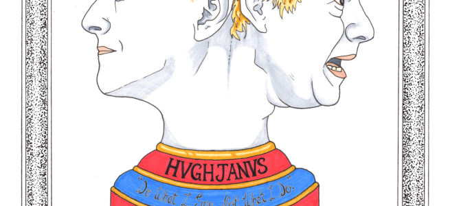 Hughjanus has two faces, mounted back to back. His head is constantly spinning around Exorcist-style, so that each visage can try to defend and excuse the behaviour of the other in turn. The first face appears bluff and jovial, luring you in, the reverse has a sinister countenance and is known as, “The Glower Behind the Throne.” Statues of Hughjanus usually only depict the head, as the rest of his body is all arse.