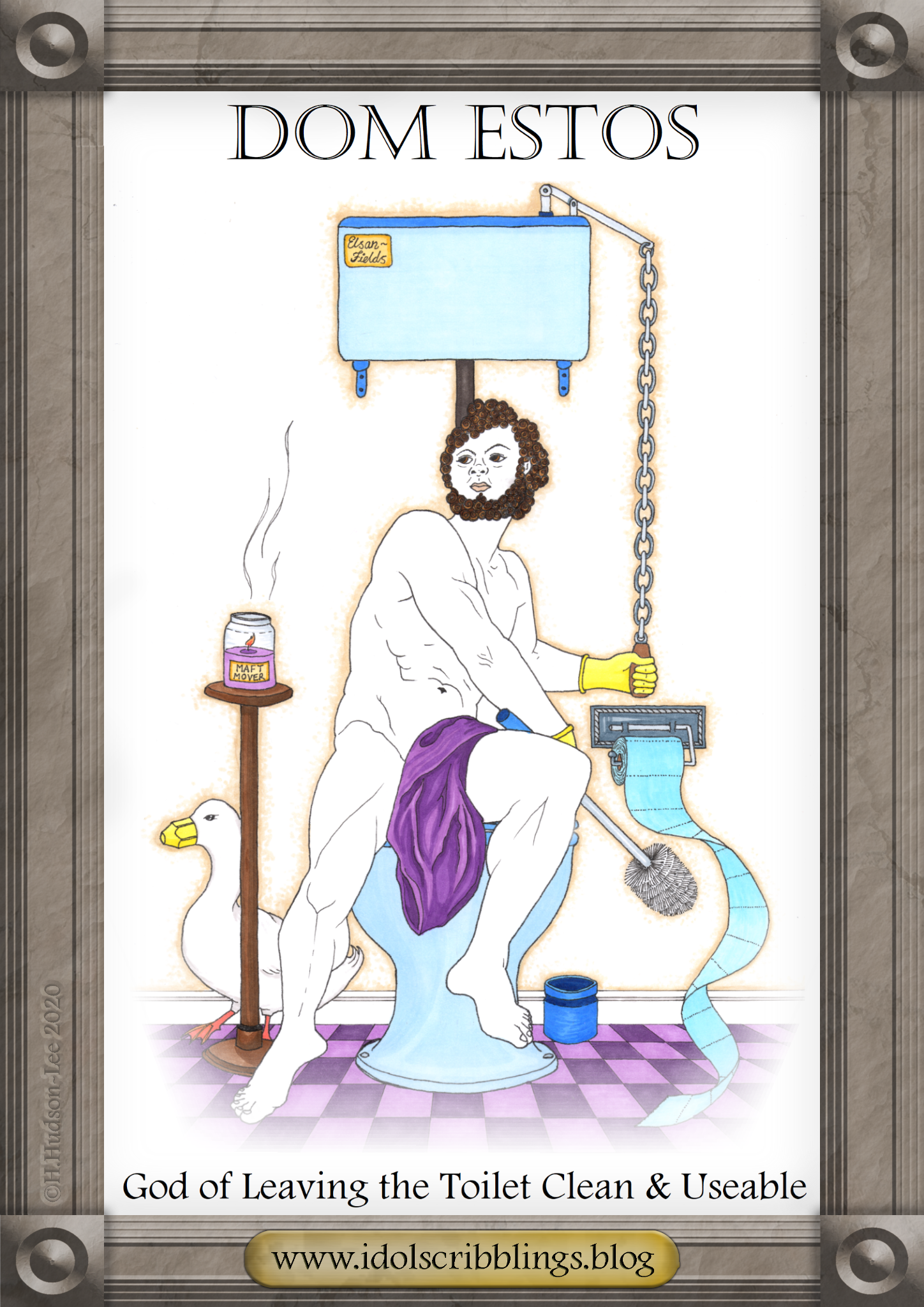 Dom Estos is essentially the god of being considerate to those who have to follow you into the stalls of life. He is also known as “The Toilet Attendant of the Gods”. His mythology begins during the Aphedronomachy*. This unfortunate incident started when some bad meat was burned in sacrifice to the Gods. Poor Zeus was loose and Hera never felt queerer. Following this harrowing battle of the bowels, the King and Queen of the Gods decided that there should be a deity responsible for ensuring that the divine derrieres always had a clean throne to sit on.
