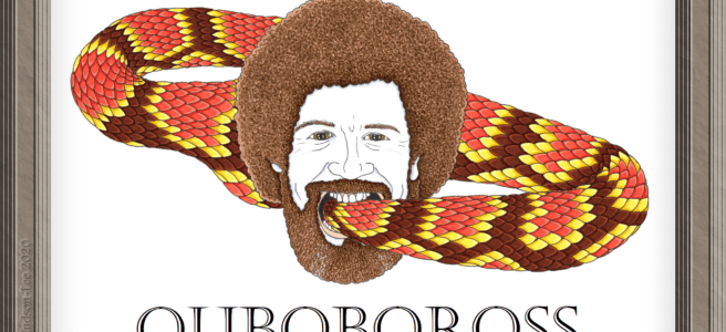 The divine demi-beast Ouboboross is worshipped as a symbol of the eternal endurance of art and the joy it brings to humanity. He did not intend to swallow his own tail. However, he decided that this had not been a mistake, just a happy little accident, and he stuck with it. (Although some jealous minor deities accused him of doing it to try and make his ars longa). He is a deity of enormous power. He has the ability to move trees, rivers and even mountains with the stroke of a pallet knife. He also has the power to magically transform human errors into beautiful flocks of birds or lazy waterfalls. Ouroboross is also famed for ability to miraculously cure insomnia. His low sultry voice is said to be capable of lulling a caffeinated two year old to a restful slumber.