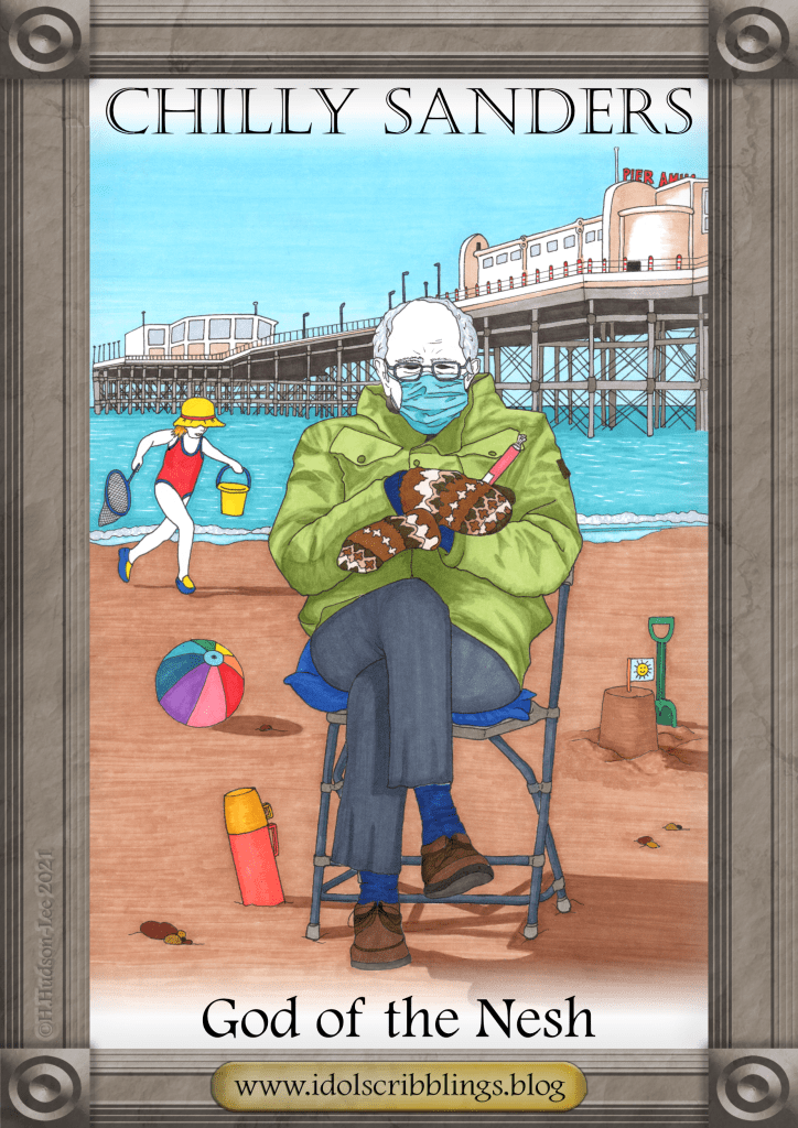 The temple of Chilly Sanders is in Burrrrrrrlington, Vermont. When a non-believer enters the temple of Chilly Sanders their face will instantly melt. This is not due to any Indiana Jones style ancient curse. It is simply because the temple is always maintained at a toasty 38oC by the gargantuan five jet Robinson-Willey gas fire, in which burns their sacred eternal flame. On entering the temple, each worshipper is greeted by the priests with a rousing chorus of, “Put the wood in the hole! Were you born in a barn?” The worshipper will then hang their cap on one of the impressive temple hat pegs. The priesthood can be recognised by the sacred giant knitted mittens which they must wear at all times. The church undertakes lots of good works in the community. These include supplying hot meals daily to the vulnerable. They fund this endeavour by manufacturing much sought after t-shirts bearing the image of the god.