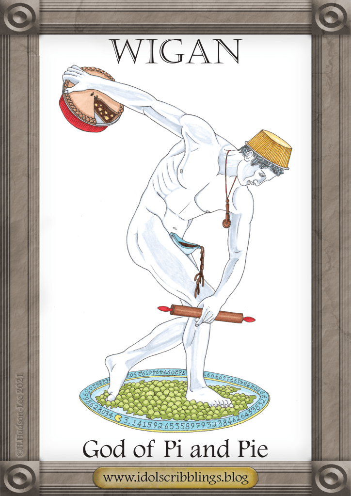 Wigan, the deity of Pie and Pi, is without pier amongst the gods. He, and his divine consort Ashet exist in a pattypantheon of their own. Beloved by mathematicians, bakers and gourmets alike, who see him as the sauce of all goodness (mint sauce to be precise). He is the only god who has managed to calculate the circumference, surface area and volume of the celestial spheres. His followers have no time for other religions, they believe that only their god is pukka. They believe that Wigan created the first man from pastry dough, and then crafted the first woman from one of the man’s kidneys. Later in the tale, the woman is tempted to eat the Apple Pie of Knowledge by a serpent. This is known as the Snake and Kidney theory of creation.