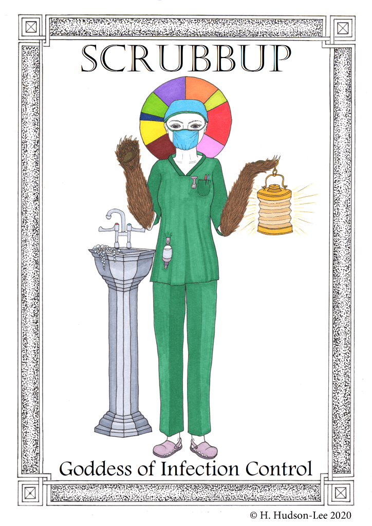 There are many deities of healing, but Scrubbup beats them all, as the prevention is always better than the cure. Whist she mostly takes the form of a human female, she is all bear below the elbows. Of all the deities, Scrubbup is considered to be humanity’s first and best line of defence against disease. Many people are surprised to learn that Scrubbup is a deity of the modern age, coming into being sometime in the mid 1840’s. About the time that people started to realise that, if you don’t wash your hands after using the bathroom, you and your friends may as well greet each other by sticking your hands down each other’s pants. The early pioneers of her sect, who first started to preach the word of Scrubbup were disbelieved, derided, stigmatised, and even martyred. Physicians were supposed to cure disease, surely they could not be spreading it! Some of these early radicals have since been elevated to sainthood or “saintised”. Such as Saint Ignaz Semmelweis, Saint Florence of Nightingale, Saint Dora of Walsall and Saint John Snow (who knew a surprising amount, but it took him ages to get anyone to listen).